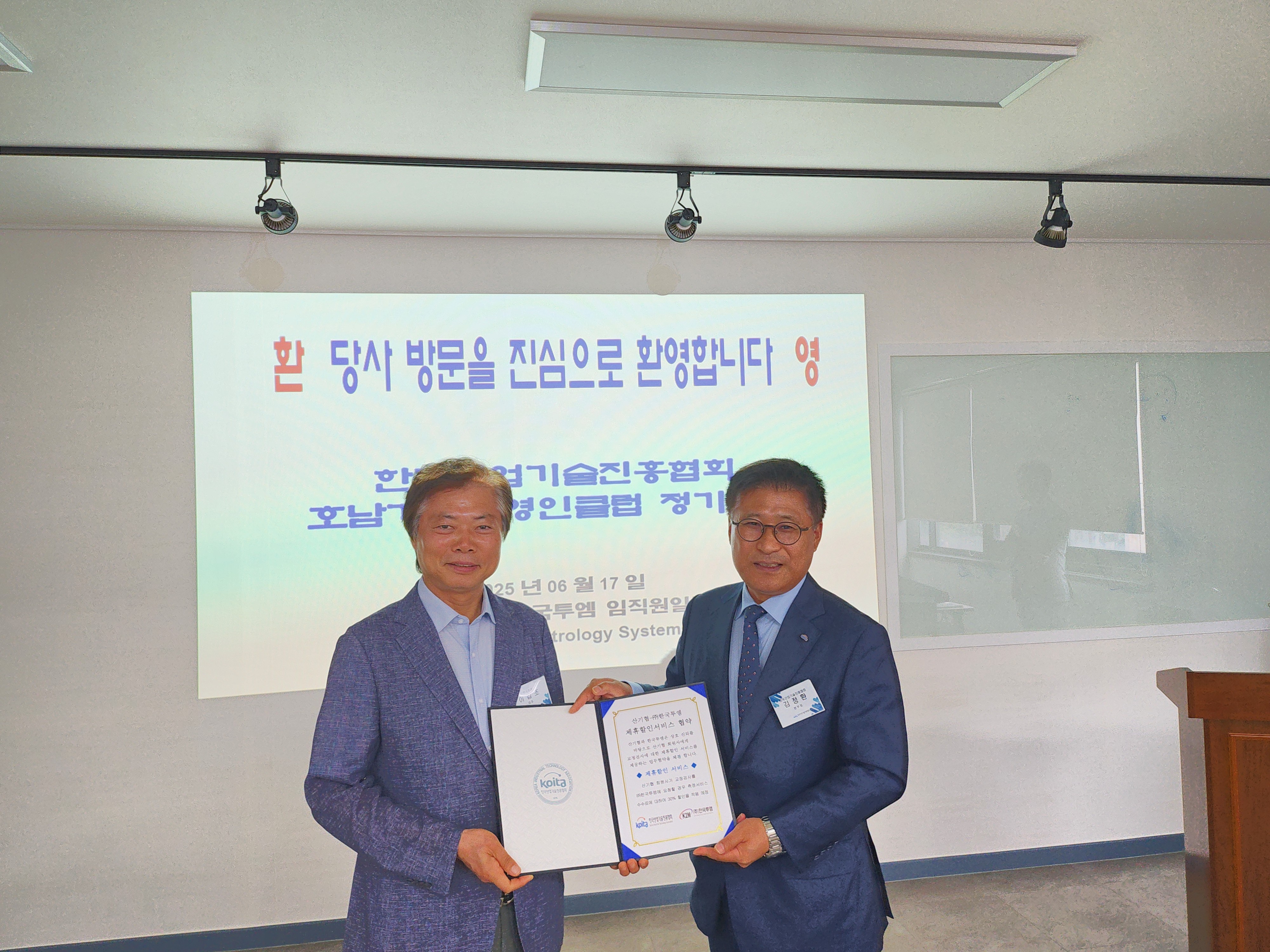당사는 한국산업기술진협협회와 제휴할인서비스 협약을 체결하고 산기협 회원사들에게 상호 신뢰를 바탕으로 산업측정기기 교정에 대한 수수료 할인 서비스를 제공하기로 하였다. 제휴할인서비스 협약식을 2025.06.17. 한국산업기술진흥협회 김정환 본보장님과 당사 이갑조 대표가 당사에서 개최된 호남기술경영인클럽 정례회에서 거행하였으며, 이에 따라 앞으로 산기협 회원사들이 (주)한국투엠에서 교정을 실시할 경우 교정수수료의 30%를 할인 받을 수 있게 되었다.